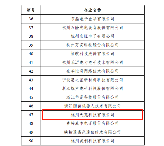 喜訊!天寬入選2020年浙江省電子信息產(chǎn)業(yè)百家重點(diǎn)企業(yè)