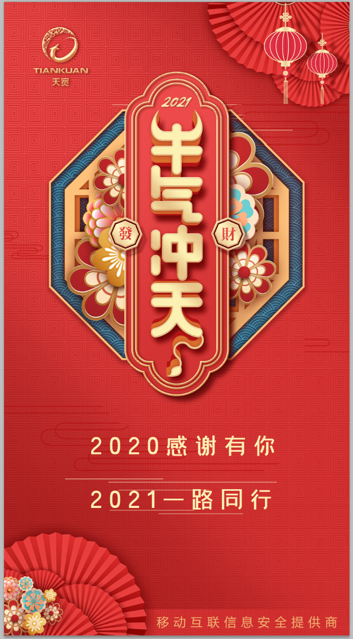 新元復(fù)始,萬(wàn)象更新。在辭舊迎新之際,杭州天寬科技有限公司向所有的客戶、合作伙伴、股東和公司員工,以及關(guān)心和支持天寬發(fā)展的社會(huì)各界友人,致以最誠(chéng)摯的祝福和最衷心的感謝!2020年,是極不平凡、充滿挑戰(zhàn)的一年,天寬牢牢把握信息安全行業(yè)發(fā)展的歷史機(jī)遇,充分發(fā)揮自主研發(fā)與技術(shù)創(chuàng)新的優(yōu)勢(shì),以優(yōu)質(zhì)的產(chǎn)品和服務(wù)持續(xù)為客戶創(chuàng)造價(jià)值。這一年,在疫情的沖擊下,公司逆勢(shì)而上,取得了令人鼓舞的業(yè)績(jī),凈利潤(rùn)同比增長(zhǎng)超過(guò)80%。市場(chǎng)占有率進(jìn)一步提升,交付了多個(gè)十萬(wàn)用戶數(shù)以上的大型項(xiàng)目;與浙江移動(dòng)共同推出了“云端安全管控”產(chǎn)品,實(shí)現(xiàn)了產(chǎn)品及商業(yè)模式的創(chuàng)新;同時(shí),我們?yōu)殡娏π袠I(yè)定制的天寬“新一代電力物聯(lián)網(wǎng)安全終端”在中電聯(lián)產(chǎn)品技術(shù)鑒定會(huì)上獲得國(guó)內(nèi)領(lǐng)先、國(guó)際先進(jìn)的高度評(píng)價(jià),產(chǎn)品已經(jīng)廣泛的在國(guó)網(wǎng)及南網(wǎng)各個(gè)省份得到規(guī)模商用,累積用戶數(shù)超過(guò)十萬(wàn)。這一年,公司獲得了全球軟件領(lǐng)域最高級(jí)別CMMI5級(jí)認(rèn)證,中國(guó)網(wǎng)絡(luò)安全企業(yè)100強(qiáng),浙江省電子信息50家成長(zhǎng)型企業(yè)等諸多榮譽(yù),參與國(guó)家等保2.0相關(guān)標(biāo)準(zhǔn)的撰寫,并獲得西湖區(qū)科創(chuàng)直投基金千萬(wàn)級(jí)投資,以及更多同行者的全方位支持。2021年,我們團(tuán)結(jié)一心,攜手共進(jìn),開(kāi)啟新征程。天寬將在保持營(yíng)業(yè)收入與凈利潤(rùn)持續(xù)增長(zhǎng)的同時(shí),積極加強(qiáng)和國(guó)家相關(guān)科研機(jī)構(gòu)合作,通過(guò)技術(shù)研究、項(xiàng)目實(shí)踐,進(jìn)一步提升移動(dòng)互聯(lián)網(wǎng)/物聯(lián)網(wǎng)安全、數(shù)據(jù)安全治理、數(shù)據(jù)安全服務(wù)等領(lǐng)域的自主研發(fā)能力,夯實(shí)移動(dòng)互聯(lián)信息安全領(lǐng)域的龍頭地位,使公司成為行業(yè)一流、國(guó)內(nèi)知名的具有競(jìng)爭(zhēng)力和影響力的移動(dòng)信息安全企業(yè)。以更貼合客戶場(chǎng)景的行業(yè)解決方案與安全服務(wù),為電力、司法以及其他行業(yè)的客戶移動(dòng)業(yè)務(wù)發(fā)展保駕護(hù)航。最后,再次送上最誠(chéng)摯的問(wèn)候和最衷心的祝福,祝大家在新的一年里身體健康,工作順利,闔家幸福!