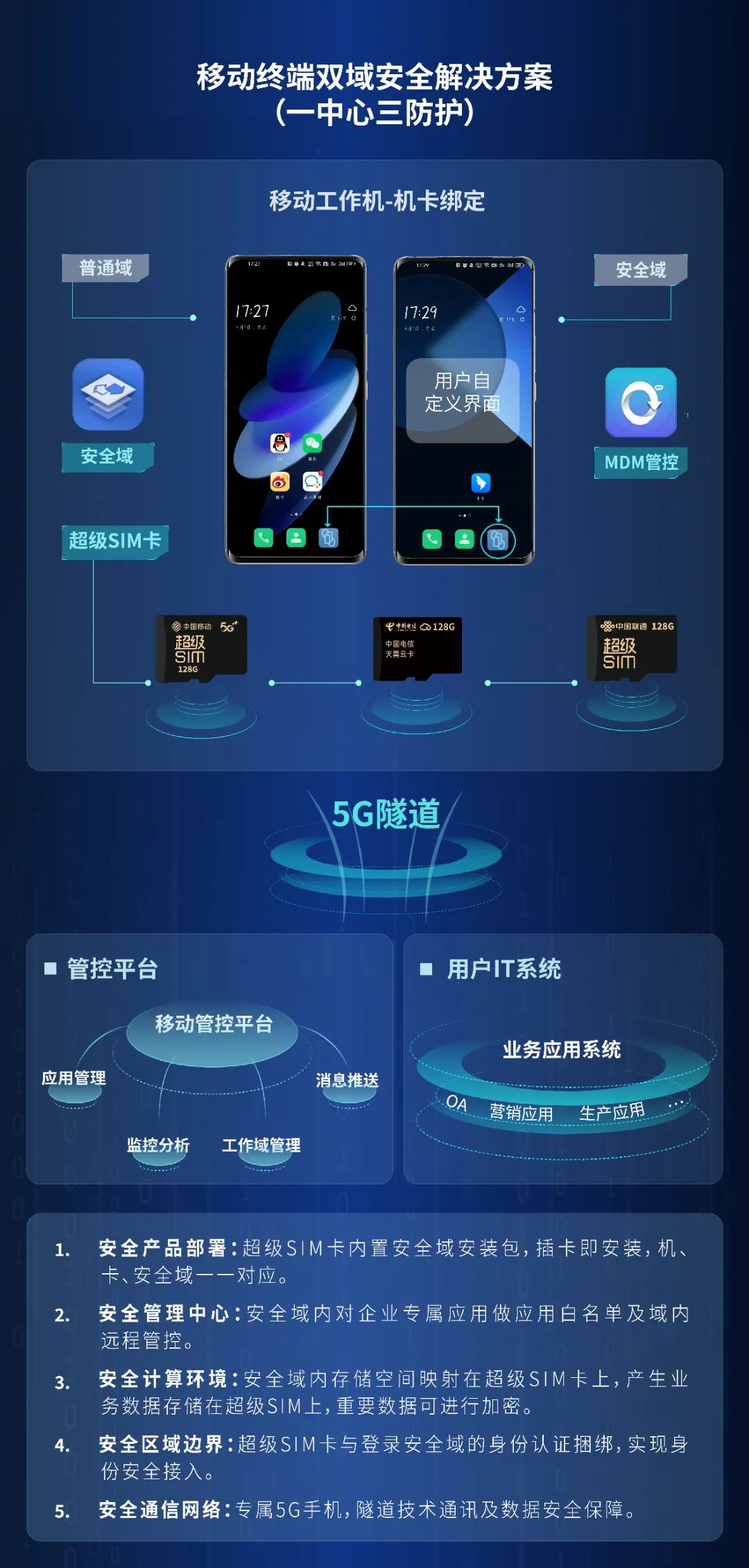 具體而言,在解決方案架構(gòu)中,安全管理中心為“一個(gè)中心”,企業(yè)可通過管理平臺(tái)配置安全域內(nèi)的企業(yè)專屬應(yīng)用,管理應(yīng)用白名單、進(jìn)行域內(nèi)遠(yuǎn)程管控;同時(shí),超級(jí)SIM卡存儲(chǔ)著安全域內(nèi)產(chǎn)生的業(yè)務(wù)數(shù)據(jù),并可采用國密算法對(duì)重要數(shù)據(jù)進(jìn)行加密保護(hù),由此建立起了安全計(jì)算環(huán)境;超級(jí)SIM卡與登陸安全域的身份認(rèn)證捆綁,則實(shí)現(xiàn)了身份安全接入,構(gòu)建起安全區(qū)域邊界;匹配專屬5G手機(jī),采用隧道技術(shù)通訊防止數(shù)據(jù)被非法篡改、竊聽、泄漏,則建立起安全通信網(wǎng)絡(luò)。