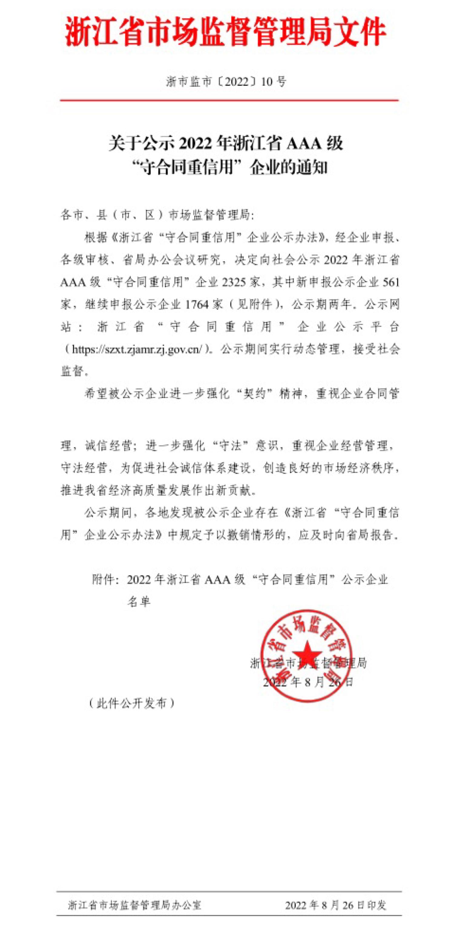 “浙江省守合同重信用企業(yè)”是浙江省為推進(jìn)全省社會信用體系建設(shè),引導(dǎo)企業(yè)建立科學(xué)規(guī)范的合同信用管理制度而對符合公示條件的企業(yè),將其合同信用等信息向全社會予以公示的行政指導(dǎo)行為,是對企業(yè)合同信用管理、合同行為、合同履約狀況、經(jīng)營效益、社會信譽(yù)等方面較高水平的行政認(rèn)可,也是省內(nèi)最具含金量和最受社會認(rèn)可的企業(yè)信用水平認(rèn)定稱號之一,“AAA級”是最高等級。