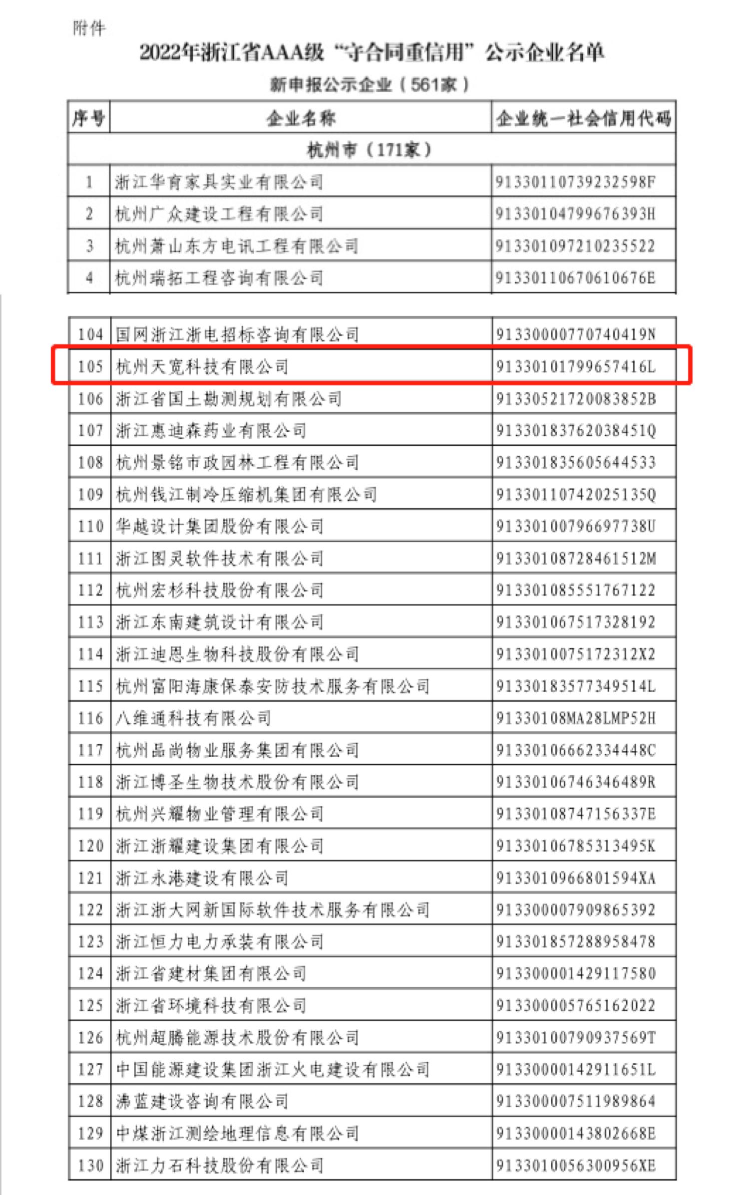榮譽(yù)丨天寬榮獲浙江省aaa級“守合同重信用”企業(yè)稱號