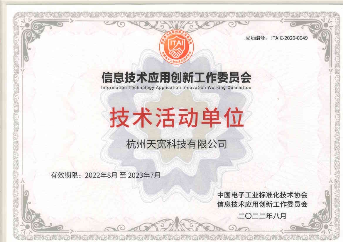 榮譽(yù)丨天寬榮獲信創(chuàng)工委會(huì)技術(shù)活動(dòng)單位證書