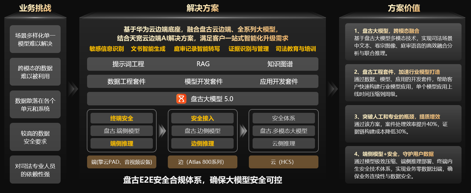 天寬獨家展出和發(fā)布了基于盤古大模型5.0構(gòu)建的行業(yè)大模型解決方案:司法行業(yè)智法助審解決方案。該方案是基于華為昇騰智算云底座,融合盤古大模型5.0,結(jié)合天寬云邊端AI技術(shù)而打造的聯(lián)合解決方案,構(gòu)建了從證據(jù)智能歸集——庭審記錄智能轉(zhuǎn)寫——文書智能生成的全鏈路AI輔助體系,滿足司法行業(yè)高合規(guī)、高可用的智能化升級需求。