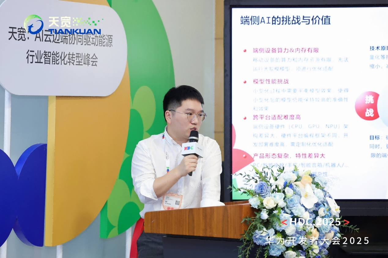 隨著AI能力從中心向邊緣下沉,端側智能化成為不可逆轉的趨勢。天寬CTO龔徐建以《基于鴻蒙的端側AI解決方案》為題,詳細介紹了公司在輕量模型設計與推理框架構建上的核心能力。該方案已與鴻蒙系統(tǒng)深度協(xié)同,在手機、平板等設備中實現(xiàn)“本地智能”部署,極大提升了AI在端側的響應效率與部署靈活性。