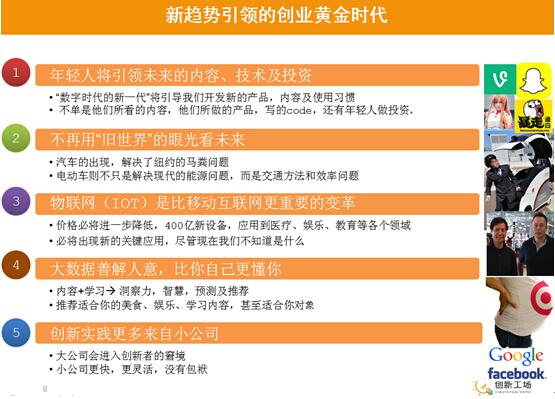 首先我稱(chēng)為數(shù)字革命帶來(lái)的黃金創(chuàng)業(yè)時(shí)代,這個(gè)可能是針對(duì)全球來(lái)看的。第二個(gè)談到數(shù)字革命真的在深度地改變著我們的未來(lái),未來(lái)還是更美好的。走向全球,我們還面臨著什么樣的新機(jī)遇,在中國(guó)的創(chuàng)業(yè)者怎樣最好地把握這樣的一個(gè)創(chuàng)新創(chuàng)業(yè)的數(shù)字時(shí)代的機(jī)遇。最后談?wù)勎覀兊膭?chuàng)新工場(chǎng)每一天在做著什么樣的工作來(lái)幫助這些中國(guó)創(chuàng)業(yè)者走向未來(lái),領(lǐng)跑全球。