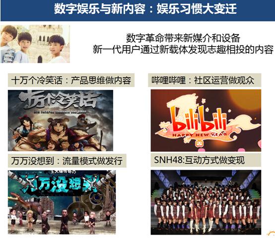 最后一點(diǎn)舉例的是,這里面說(shuō)了很多是年輕人所引領(lǐng)的,在創(chuàng)新工場(chǎng)我們很多的投資總監(jiān)經(jīng)理,冒充青少年玩各種東西,玩了之后,告訴我們有幾個(gè)特別有趣的東西,十萬(wàn)個(gè)冷笑話(huà)是一個(gè)純粹用互聯(lián)網(wǎng)制造動(dòng)畫(huà)的過(guò)程,而且是社區(qū)里面提取出來(lái)的東西。萬(wàn)萬(wàn)沒(méi)想到,也是一個(gè)互聯(lián)網(wǎng)帶來(lái)的一個(gè)網(wǎng)上的劇,而且把無(wú)名的人變成了在中國(guó)非常知名的明星。嗶哩嗶哩,很多90后的食品在這里分享和看。SNH48雖然是女子的歌唱團(tuán),實(shí)際上他們形成了一個(gè)巨大的社區(qū),讓很多的人不但能夠?qū)嶋H參與,能夠看這些可愛(ài)的女孩的表演,歌舞、電視,上了五個(gè)春晚等等。除此之外,有一個(gè)虛擬的APP給他互動(dòng),這可能也是新的互聯(lián)網(wǎng)模式。其實(shí)這些東西,都是95后或者90后他們玩出來(lái)的,要了解下一個(gè)趨勢(shì)是什么,未來(lái)的80后90后要做什么,真的要看他們,更多的眼球是要放在更移動(dòng)式互聯(lián)網(wǎng)式,互動(dòng)式的內(nèi)容里面。如果我們說(shuō)出版業(yè)還在想,電子書(shū)會(huì)怎么影響我們,網(wǎng)上新聞怎么影響我們,那已經(jīng)慢了一步,實(shí)際上90后00后關(guān)注的不是文字的內(nèi)容,更多的是互動(dòng)式的內(nèi)容。