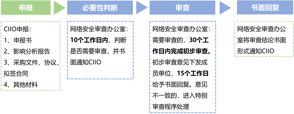 通過“自主預判,主動申報”的方式,在采購網(wǎng)絡產品和服務時,CIIO運營者應當預判產品或服務投入使用后所帶來的國家風險,如可能產生影響,主動向網(wǎng)絡安全審查辦公室申報。