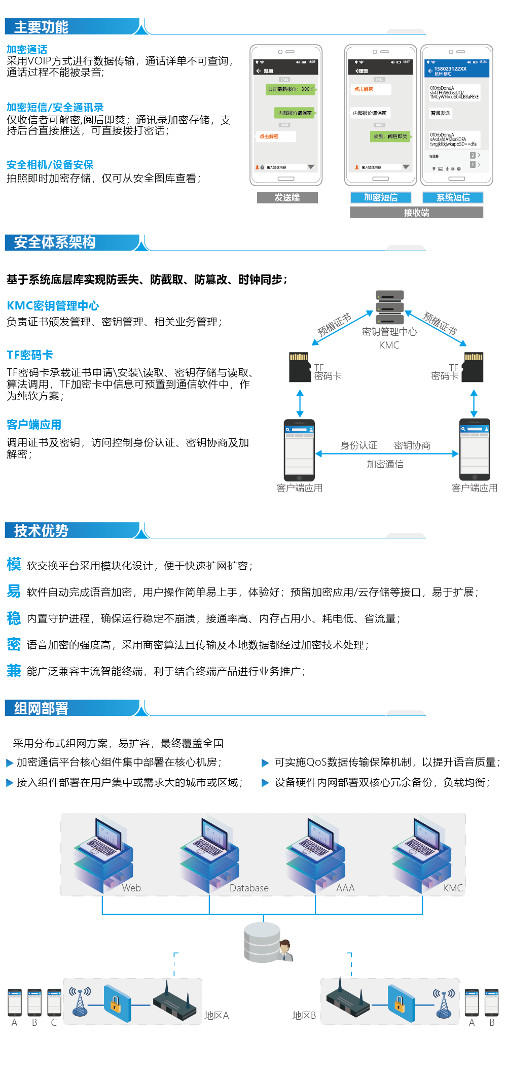 內網(wǎng)移動加密通信系統(tǒng)——天寬加密通信系統(tǒng)是經(jīng)國家密碼管理局認證的商密級手機加密防護系統(tǒng),符合我國商密級別的手機通信要求。通過移動3G/4G/WIFI方式進行加密數(shù)據(jù)的傳輸,具備加密通話、加密短信、安全通信記錄、安全通訊錄等功能。主要用于有效保障移動通信安全,實現(xiàn)商密級的端到端的手機語音與短信加密,為黨、政、軍、大型企業(yè)等重要客戶提供專業(yè)化的高安全性的移動通信加密服務。