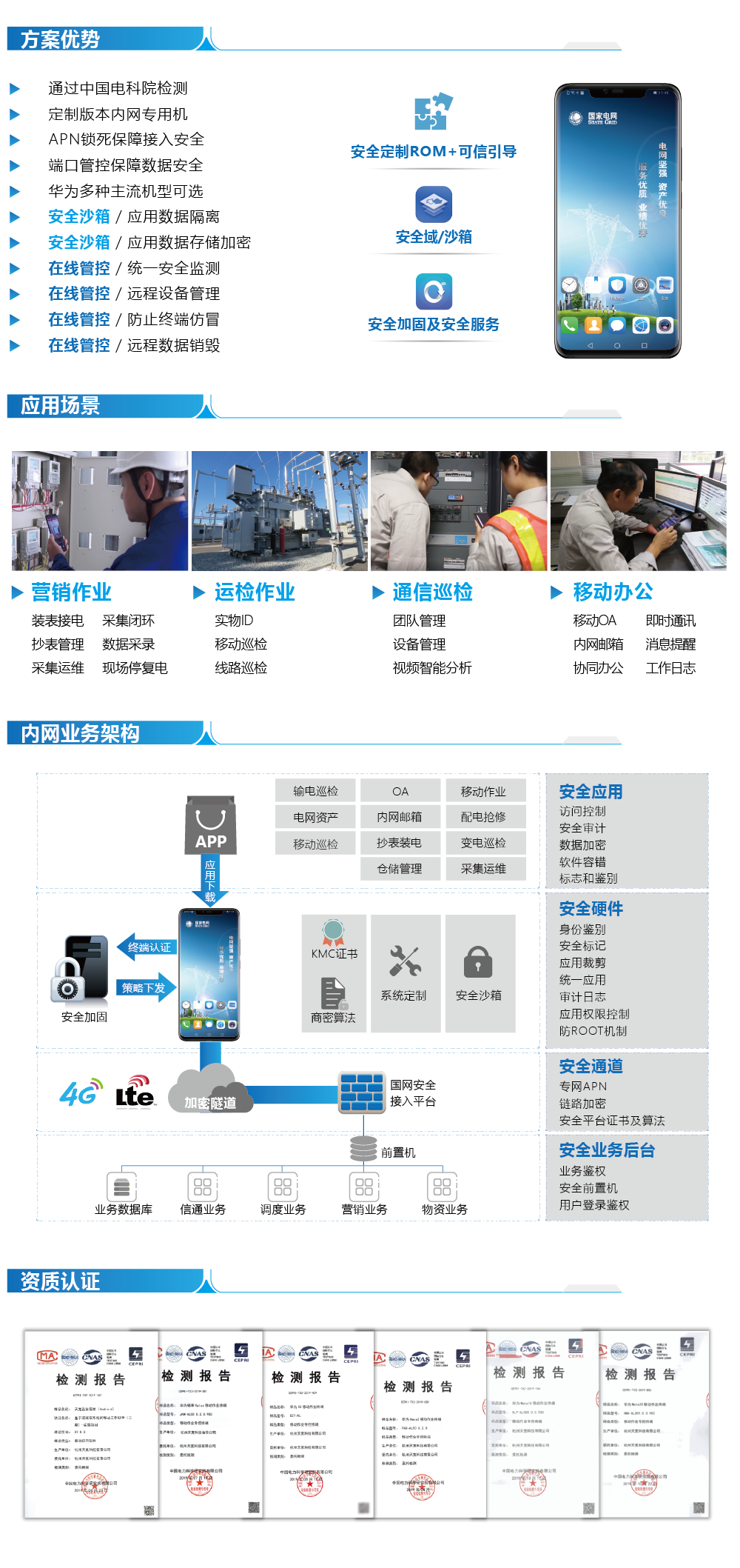電力內(nèi)網(wǎng)移動作業(yè)安全終端——以華為主流商用手機(jī)、平板為載體,深度定制電力版ROM,為電力用戶提供內(nèi)網(wǎng)移動作業(yè)安全終端。產(chǎn)品可實現(xiàn)安全登錄、防刷機(jī)、防root、應(yīng)用裁剪、安裝源限制、安全審計、插件安全等功能,滿足安全管控及應(yīng)用整合的需要。產(chǎn)品通過中國電科院《移動作業(yè)專控終端操作系統(tǒng)(Android)安全測試規(guī)范》檢測,契合國網(wǎng)互聯(lián)網(wǎng)部440號文、前信通網(wǎng)安110號文件政策指導(dǎo)要求,構(gòu)建電力內(nèi)網(wǎng)移動作業(yè)安全終端解決方案。