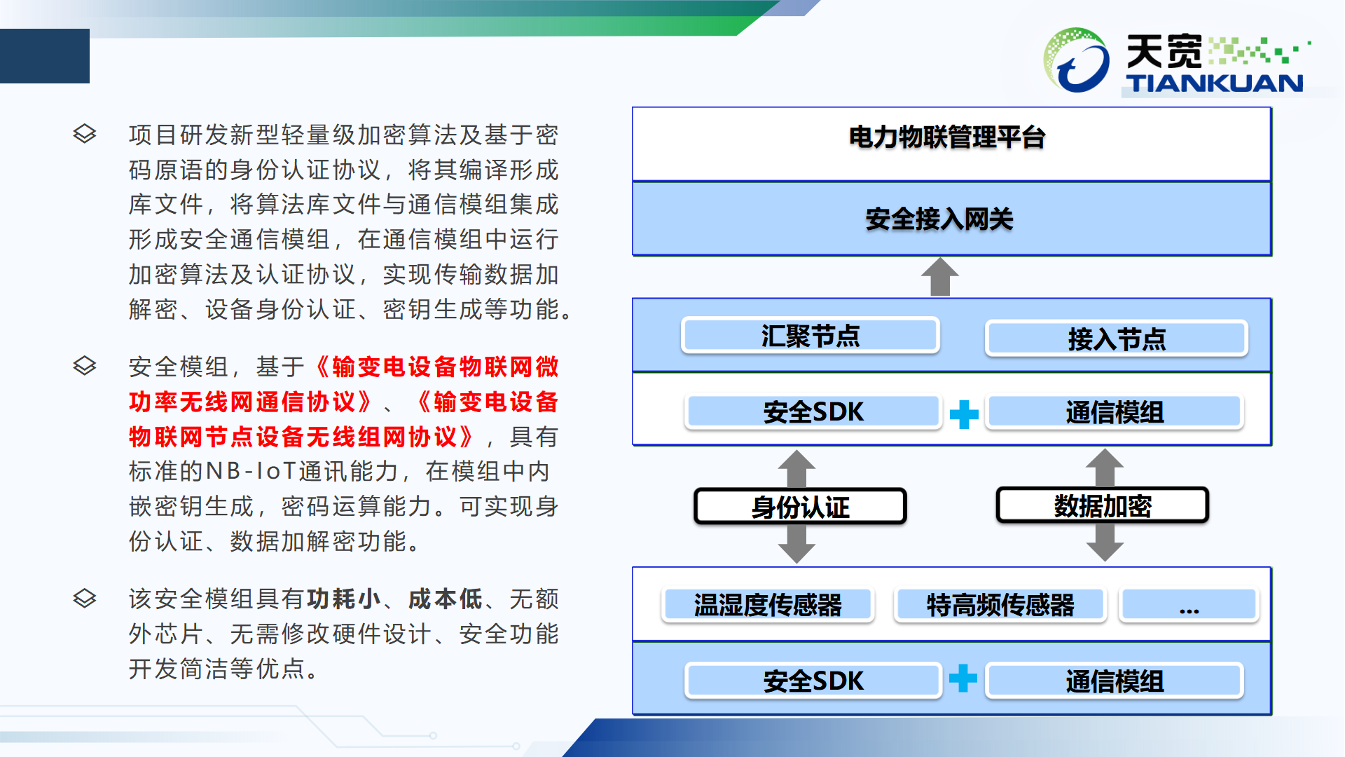 物聯(lián)網加密模組基于《輸變電設備物聯(lián)網微功率無線網通信協(xié)議》、《輸變電設備物聯(lián)網節(jié)點設備無線組網協(xié)議》,具有標準NB-IoT通訊能力,在模組中內嵌密鑰生成、密碼運算能力,可實現(xiàn)身份認證、數據加解密功能,同時具有功耗小、成本低、無額外芯片、無需修改硬件設計、安全功能開發(fā)簡潔等優(yōu)勢??梢苑奖愕貙⑽⒐β?、低功耗傳感器接入到電力物聯(lián)網無線通信網絡中。廣泛地應用在電力物聯(lián)網中的微功率、低功耗傳感器上。