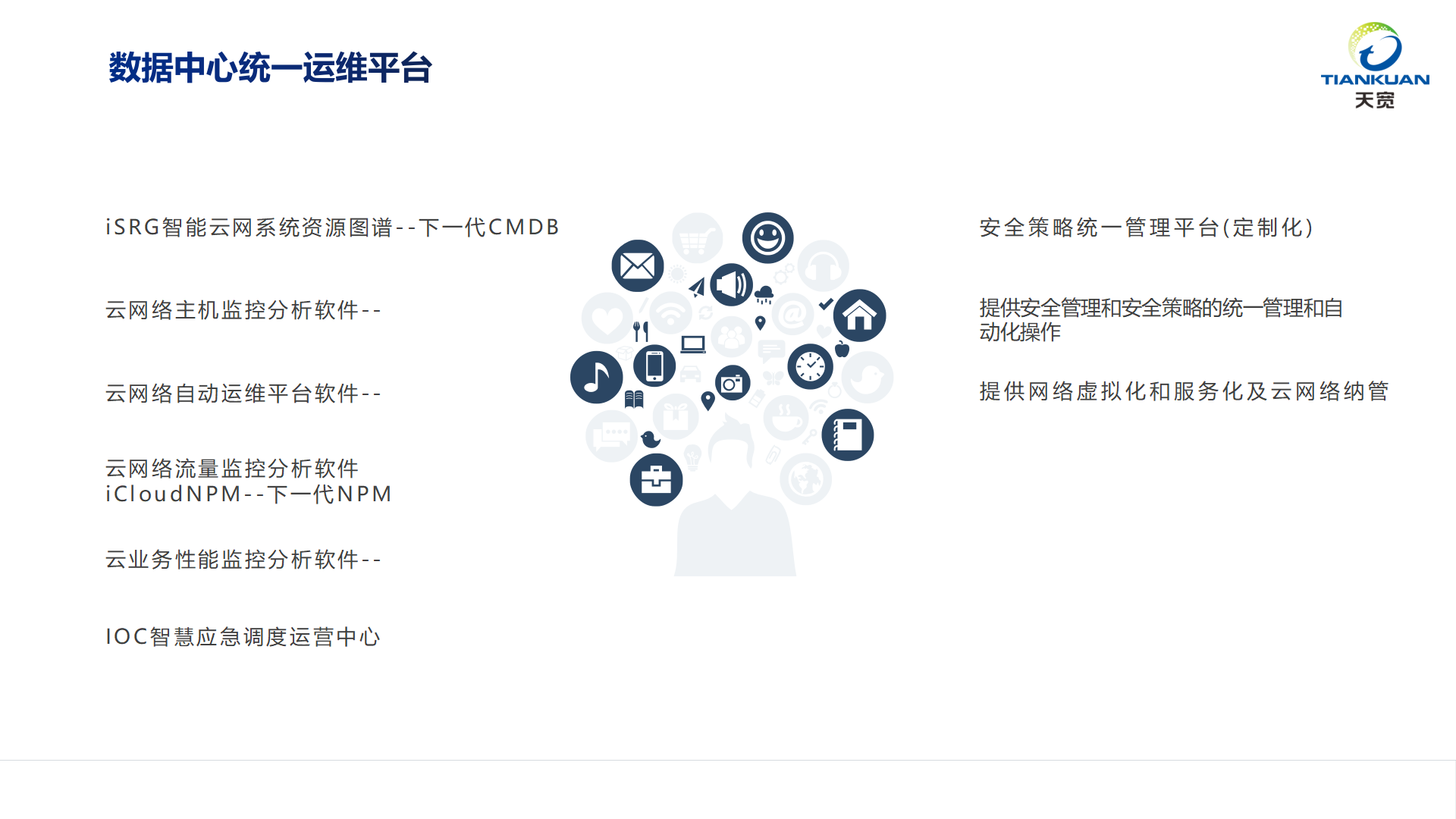 數(shù)據(jù)中心統(tǒng)一運維平臺是基于Snowburger 數(shù)字化運維平臺構建的云網監(jiān)控/一體數(shù)據(jù)中心運維平臺,包括:云網監(jiān)控平臺、云網流量性能監(jiān)控系統(tǒng)、虛擬資源監(jiān)控調度平臺、運維可視化前臺及應用,支持云網的多層、分層、虛擬化資源(SDN)、策略和云網協(xié)議及拓撲,可對接多云和PaaS服務平臺,支持提供混合云虛擬資源的全生命周期管理和彈性伸縮部署,實現(xiàn)云網和傳統(tǒng)IT基礎設施,業(yè)務和軟件系統(tǒng)的統(tǒng)一運維和管理。