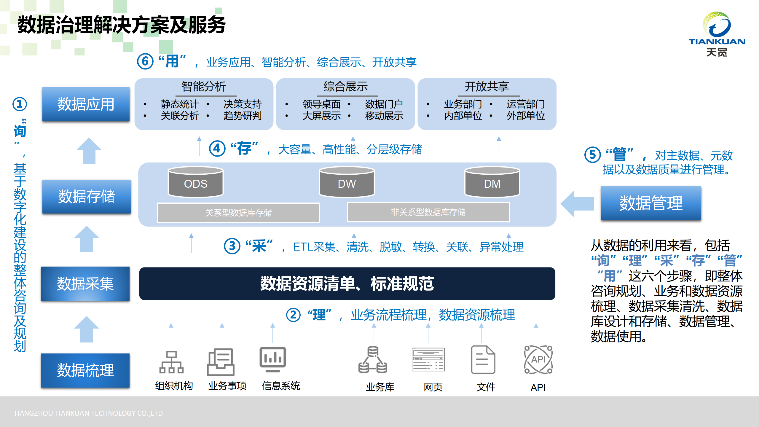 從數(shù)據(jù)“詢”、“理”、“采”、“存”、“管”、“用”六個步驟出發(fā),提供整體咨詢規(guī)劃、業(yè)務(wù)和數(shù)據(jù)資源梳理、數(shù)據(jù)采集清洗、數(shù)據(jù)庫設(shè)計和存儲、數(shù)據(jù)管理、數(shù)據(jù)使用等數(shù)據(jù)治理解決方案及服務(wù),幫助客戶更有效地管理其數(shù)據(jù)資產(chǎn),確保數(shù)據(jù)的質(zhì)量和安全,并支持?jǐn)?shù)據(jù)驅(qū)動的決策和創(chuàng)新。